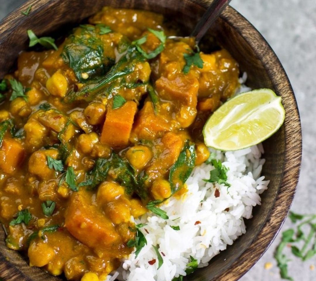 West African-style Curried Sweet Potato, Spinach and Chickpeas with rice and peas