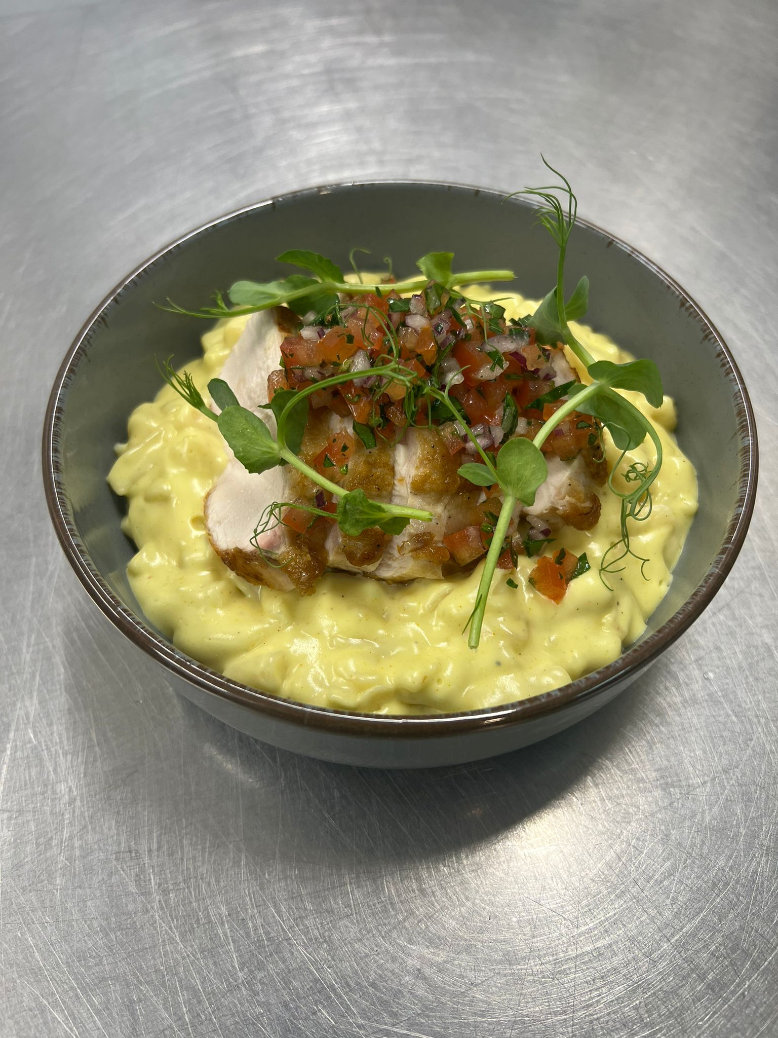 Macaroni Cheese, garlic-roasted chicken and roasted tomato relish